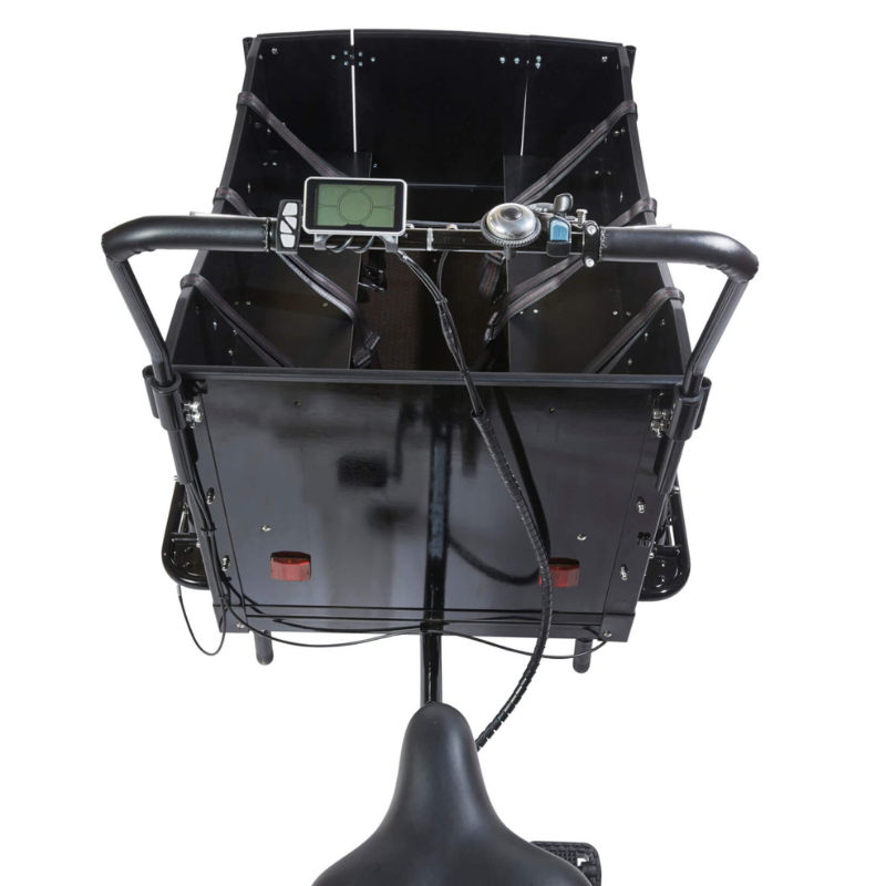 The Kindergarten comes equipped with the latest Anti-Tilt patented steering and handlebar system, ensuring effortless turning and automatic straightening. In addition, the cargo bike features a spacious cargo box with a removable canopy, two bench seats, and six Y seat belts for enhanced safety. With high-quality fenders, a luggage rack, LED headlights, and advanced controls mounted on the handlebar, the Kindergarten offers a comprehensive solution for urban families looking for a reliable and versatile mode of transportation.