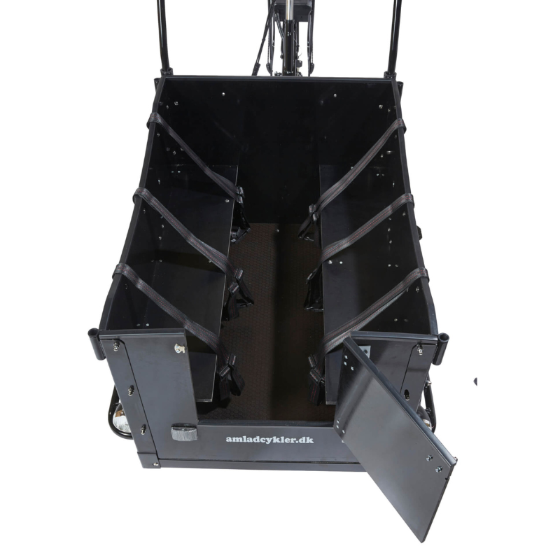 The electric cargo bike Kindergarten is tailored for young urban families seeking an affordable and eco-friendly transportation alternative. With its open-top cargo box and two opposing benches that can accommodate up to six children, complete with Y seat belts for safety, the Kindergarten provides a secure and comfortable ride. Its innovative design allows easy access through the front-facing door, enabling passengers to buckle up and embark on their journey with ease.