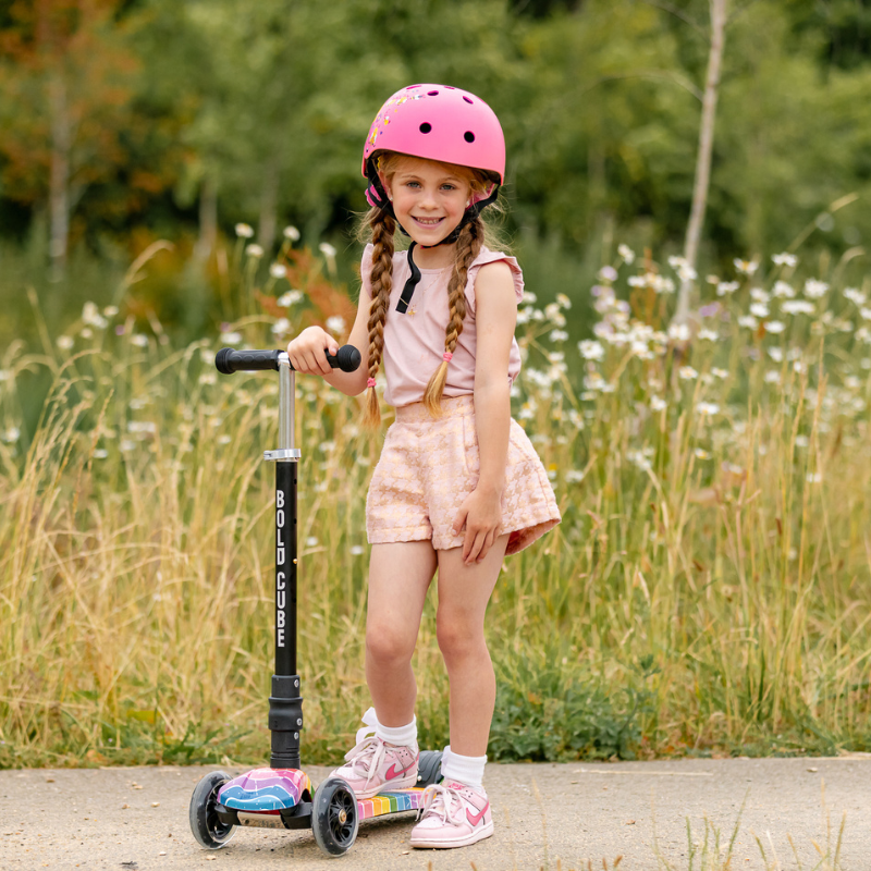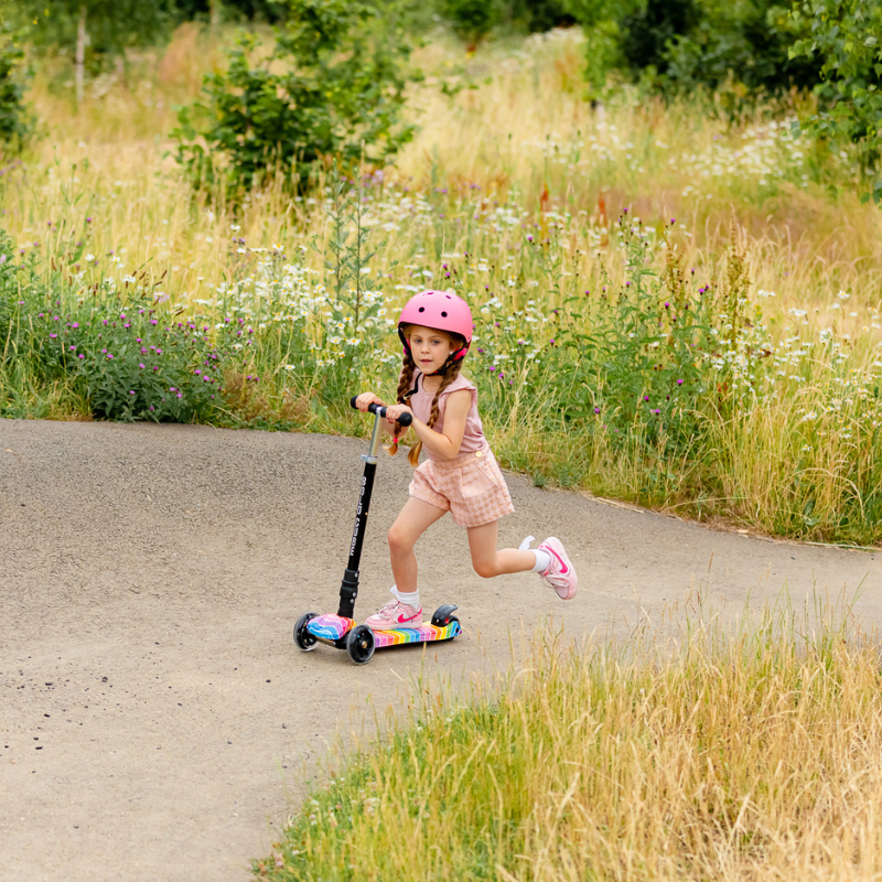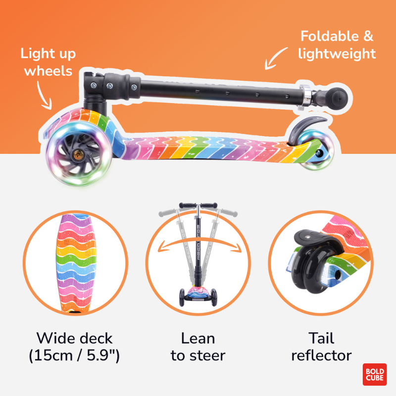 Our 3 Wheel Foldable Scooter is designed with travel in mind, making it the ideal choice for children aged 5 and older who want to commute in style or enjoy outdoor fun. As the first scooter in our range, it has been developed using insights from customer research to ensure the best experience for young riders. The scooter features a lean-to-steer mechanism that helps nurture balance and stability in budding scooting enthusiasts. With double stacked rear wheels for twice the bright flashing lights and a robust stomp brake, this foldable scooter combines safety and functionality while standing out in any crowd.