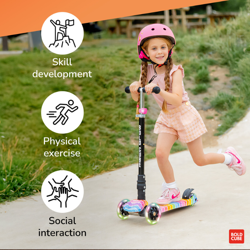 The 3 Wheel Foldable Scooter is designed for travel, making it the perfect choice for children aged 5 and older who want to commute in style or enjoy outdoor fun. Developed based on customer feedback, this scooter features a lean-to-steer mechanism that nurtures balance and stability, ensuring a smooth ride for young enthusiasts. With double stacked rear wheels for enhanced flashing lights and a sturdy stomp brake, it combines safety and functionality while standing out with its bright colors and eye-catching designs. Additionally, rear wheel light reflectors and flashing stickers provide visibility day and night. The foldable handlebar allows kids to easily store and carry the scooter, making it ideal for after-school adventures. Plus, all BOLDCUBE scooter parts are replaceable, and each scooter comes with a set of Allen keys for easy maintenance, ensuring lasting enjoyment for years to come.