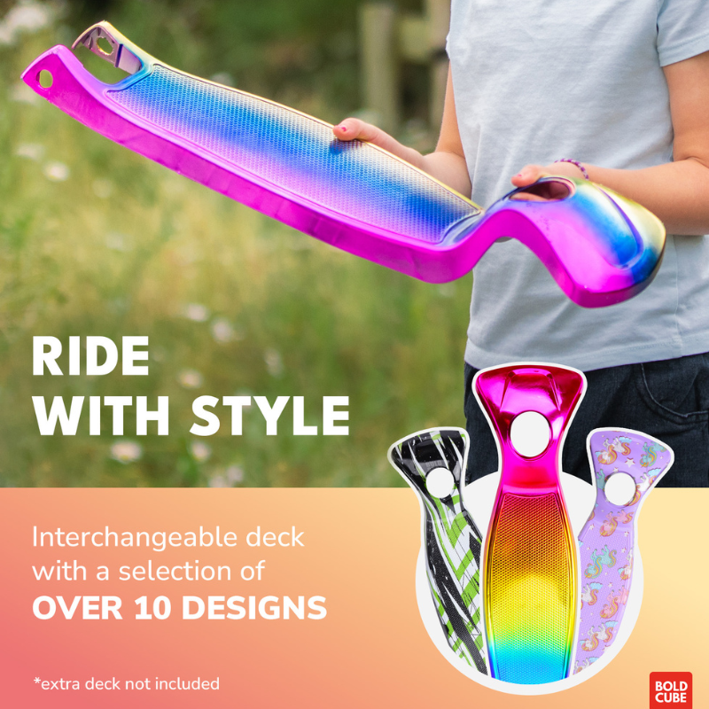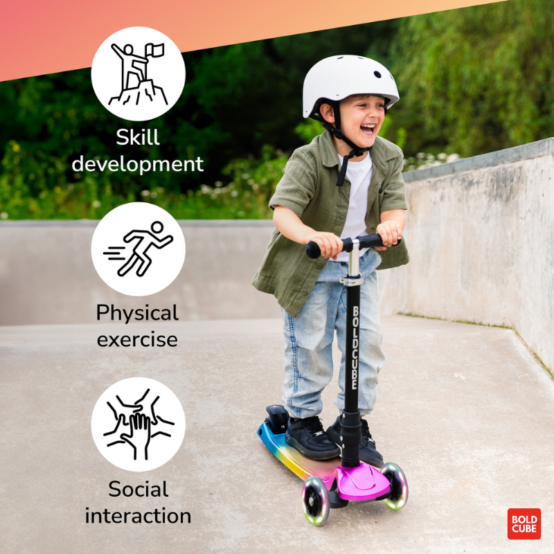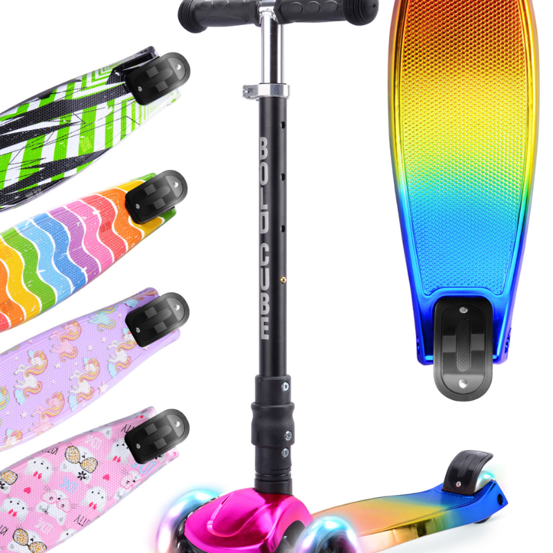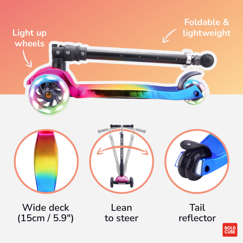 Introducing the world’s first Rainbow Chrome plated 3 Wheel Kick Scooter for kids, designed to turn heads with its hand-sprayed finish in vibrant shades of pink, yellow, green, and blue. Perfect for children aged 5 and older, this foldable scooter is engineered for travel, whether commuting in style or enjoying outdoor adventures. Its lean-to-steer mechanism nurtures balance and stability, while double stacked rear wheels provide bright flashing lights and a durable stomp brake for safety and functionality. Featuring bold colors and eye-catching designs, the scooter also includes rear wheel light reflectors for visibility. The simple pull-to-fold handlebar allows kids to easily store and carry the scooter after the school run. Plus, with all BOLDCUBE scooter parts being replaceable and accompanied by a set of Allen keys for maintenance, your child can enjoy endless fun while you rest easy knowing their scooter is built to last.