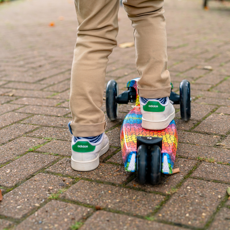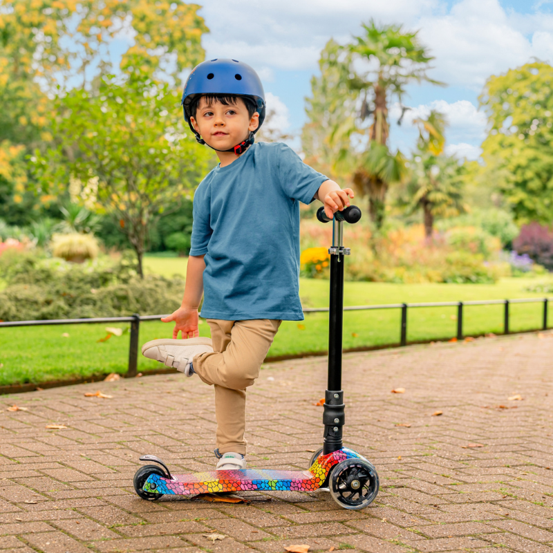 Our 3 Wheel Foldable Scooter is designed with travel in mind, making it the ideal choice for children aged 5 and older who want to commute in style or enjoy outdoor fun. As the first scooter in our range, it has been developed using insights from customer research to ensure the best experience for young riders. The scooter features a lean-to-steer mechanism that helps nurture balance and stability in budding scooting enthusiasts. With double stacked rear wheels for twice the bright flashing lights and a robust stomp brake, this foldable scooter combines safety and functionality while standing out in any crowd.