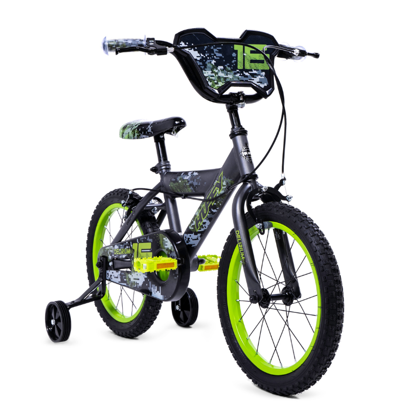 Get ready to rev up your child's racing spirit with the Huffy Delirium 16" BMX Style Bike, designed for young thrill-seekers aged 5-7. This rad bike features a cool, edgy style that's sure to turn heads, with a matte silver frame, black graphics, and racing number plate that demand attention and guarantee fun. The easy-to-use caliper brakes provide solid control, while the translucent grips reveal dual-colour graphics underneath, adding an extra touch of flair to this already-stylish ride.