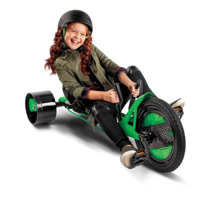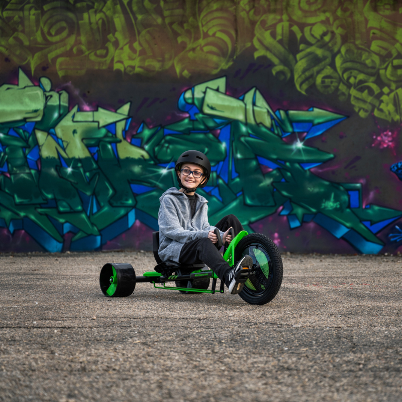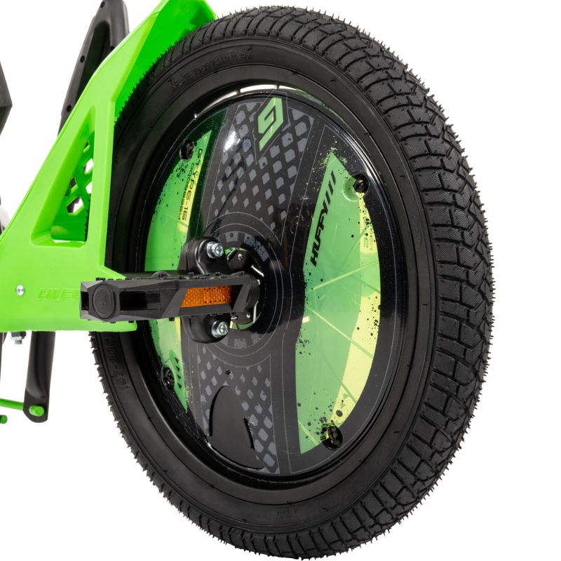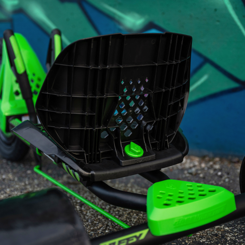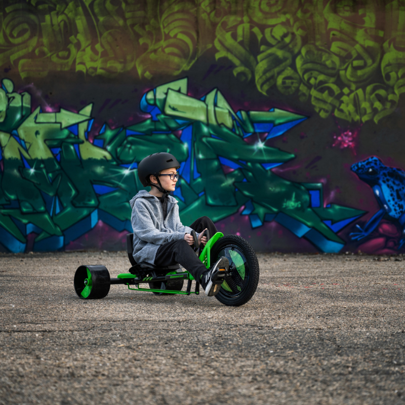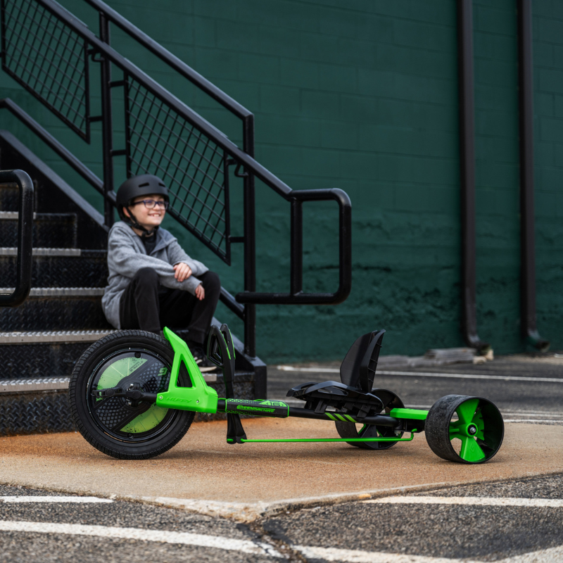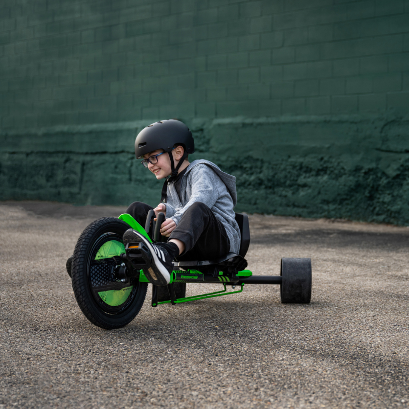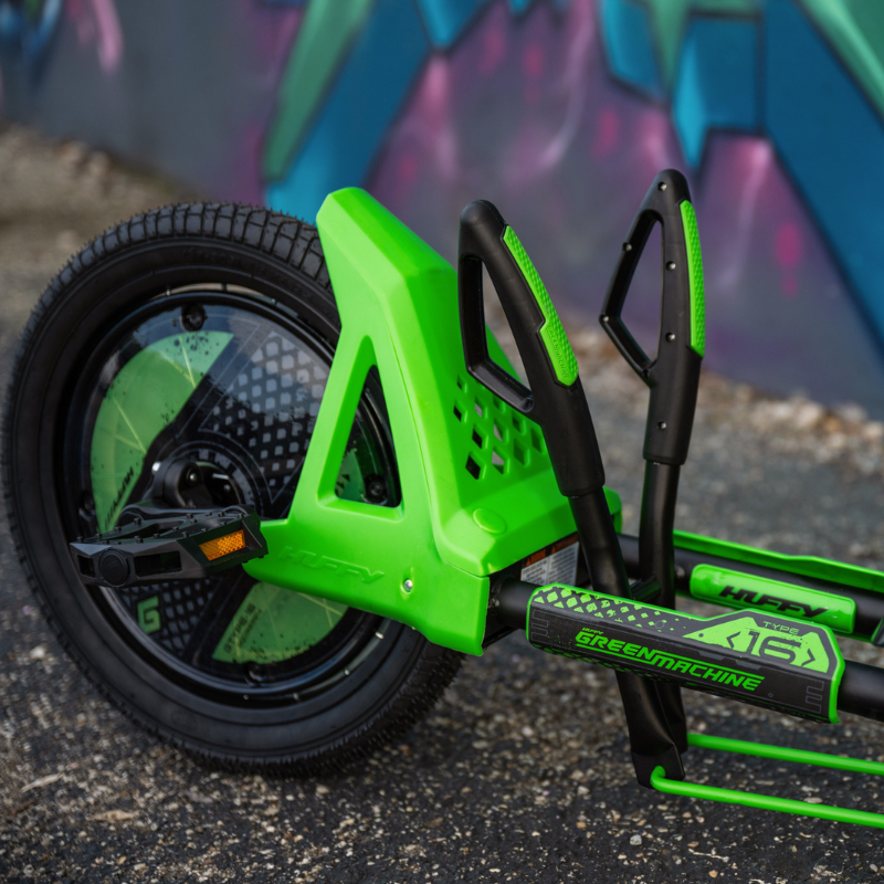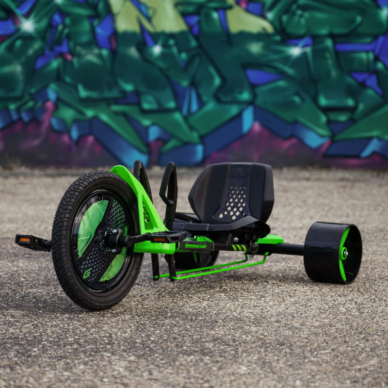 The Huffy Green Machine 16-inch Drift Trike is a reimagined version of the classic, designed to give young riders a thrilling, action-packed experience. Built with a durable black steel frame, this trike offers both stability and sleek style. Its redesigned saddle features tool-free adjustability with two settings, ensuring a secure and comfortable fit for kids as they navigate spins and drifts. The dual stick steering system provides full control, with ergonomic hand grips for a smooth and responsive ride, making this drift trike perfect for adventurous riders.