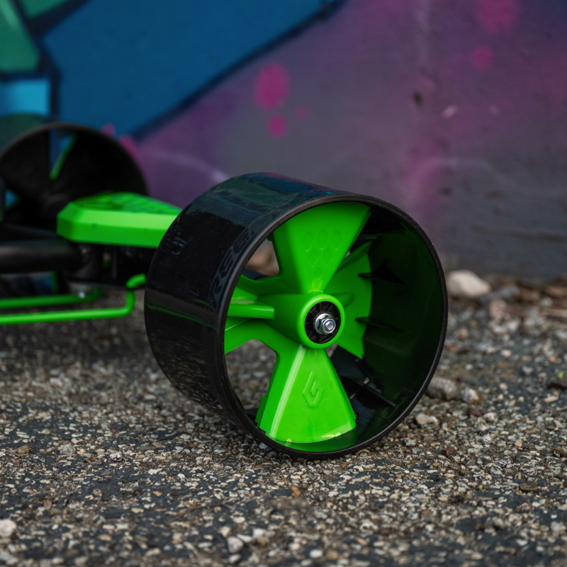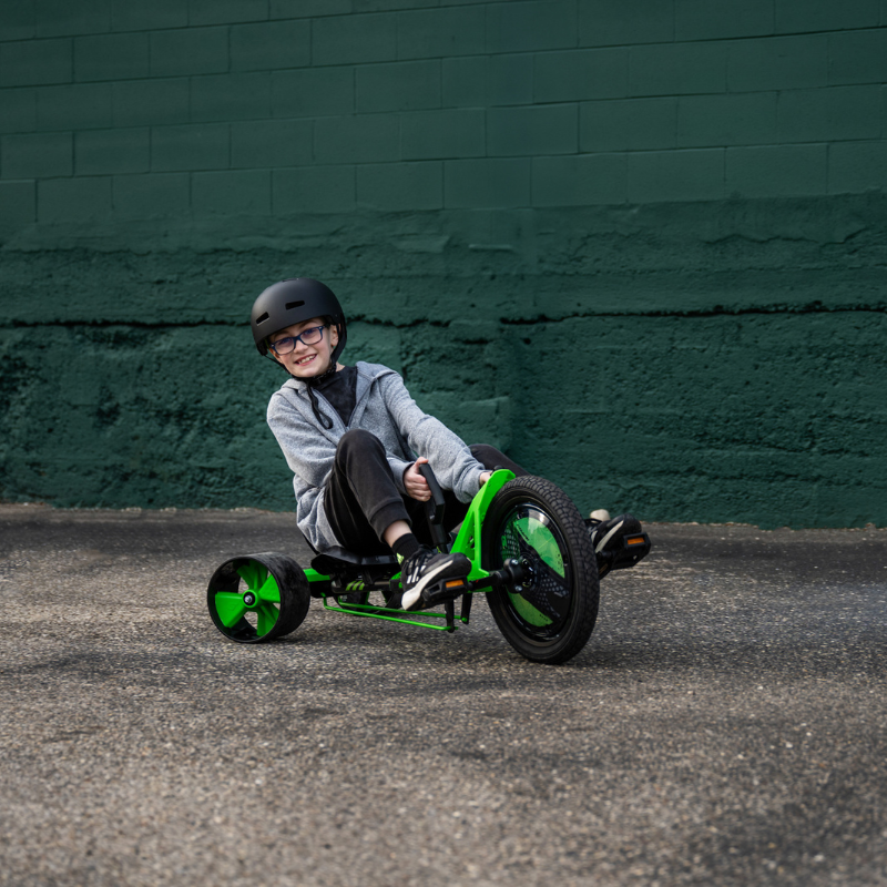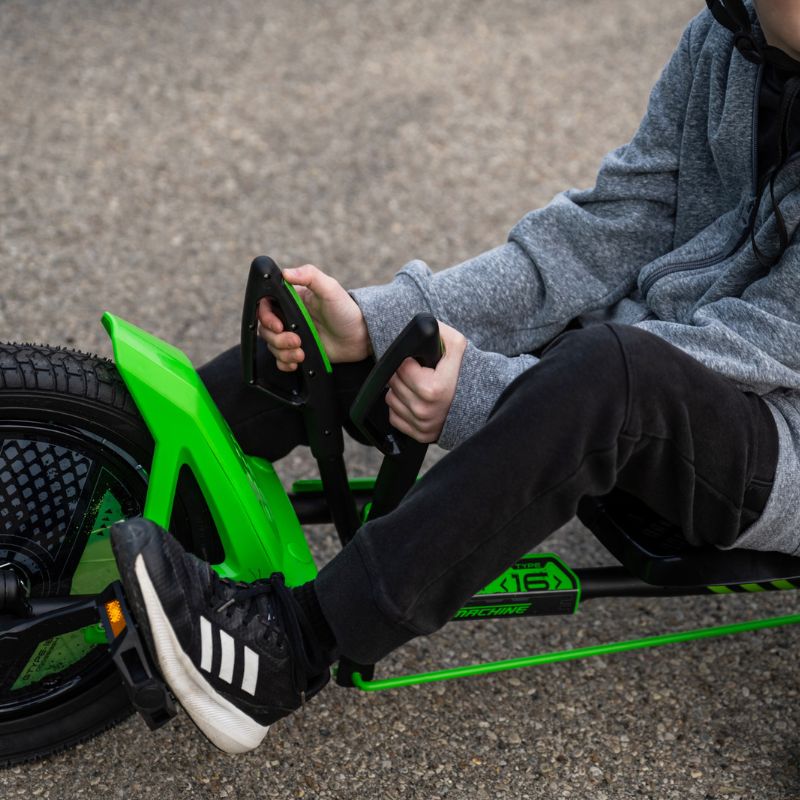 Featuring injection-molded rear wheels, the 16-inch Green Machine delivers a stable and long-lasting drifting experience, with easily replaceable wheels for when they wear down. The direct drive system and easy-to-use coaster brake allow for quick and efficient stopping, while the 16-inch front tire ensures excellent traction. Ideal for riders aged 5 to 8 years old and weighing up to 80 lbs, this drift trike is lightweight at 22 lbs, and assembly is made easy with the included tools. It's the perfect choice for young thrill-seekers ready for fast-paced fun!