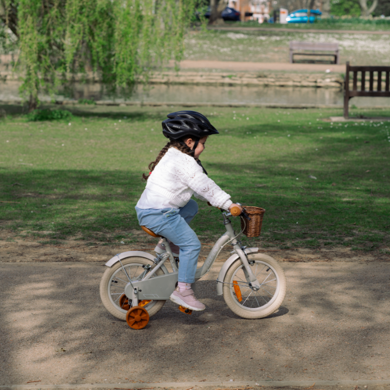 The Huffy Vintage 14-inch Girls’ Bike in warm grey is a stylish and safe first bike for children aged 4–6 years. With removable stabilisers, a front basket, handlebar bell, and enclosed chainguard, it’s the perfect blend of classic design and modern comfort.