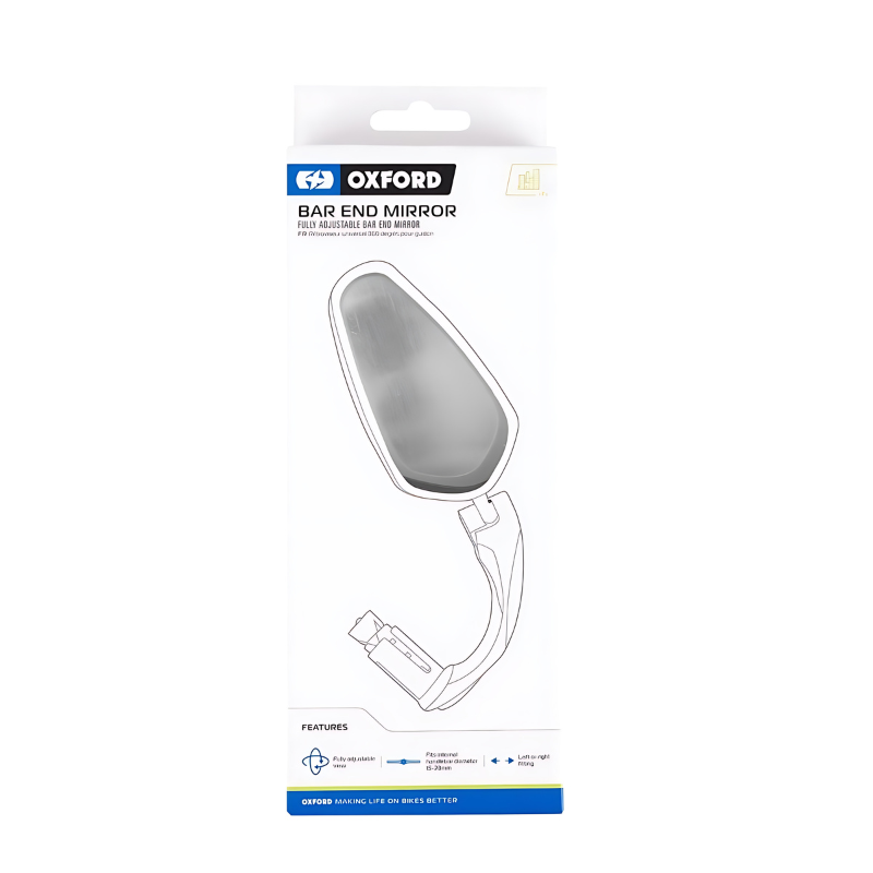 A fully adjustable cycle mirror with convex lens for a wider field of view. This mirror attaches to the bar end of your cycle's handlebar, saving you valuable space for other accessories.