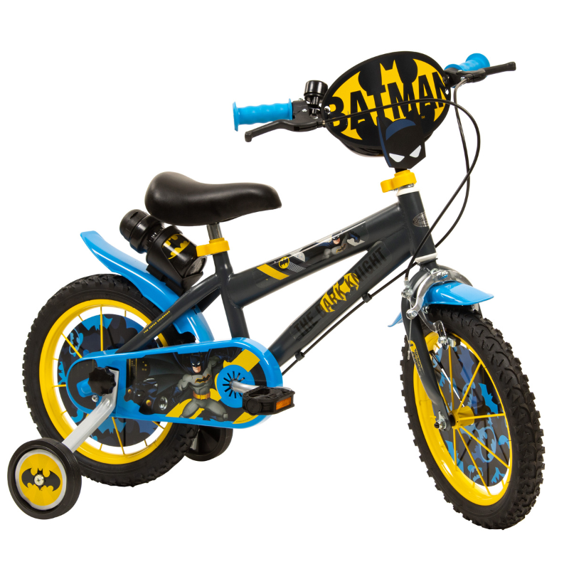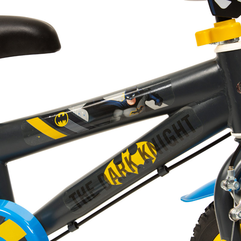 This Batman-licensed 14” bicycle is perfect for little superheroes aged 4 to 6 years (height range 100–110 cm). Finished in sleek black with vibrant Batman the Dark Knight decals, it features a front caliper brake, a rear drum brake, and 14” pneumatic tyres on sturdy spoked wheels with blue mudguards. Designed for both style and practicality, the bike includes removable stabilisers with the iconic Batman logo, an adjustable saddle and handlebars, a rear drinks holder with a bottle, and a bold Batman front shield. Ideal for beginners, this bike combines safety, comfort, and heroic flair for every adventure.