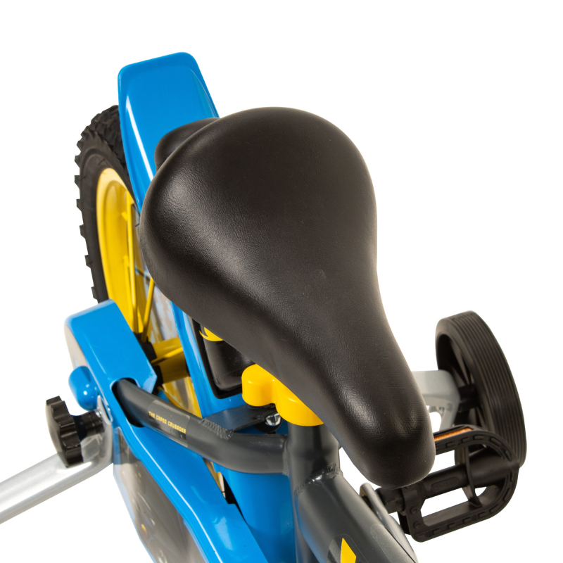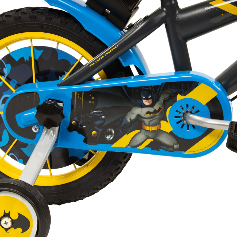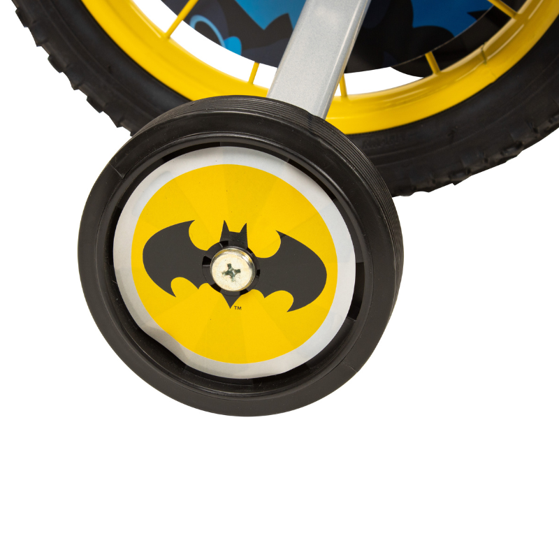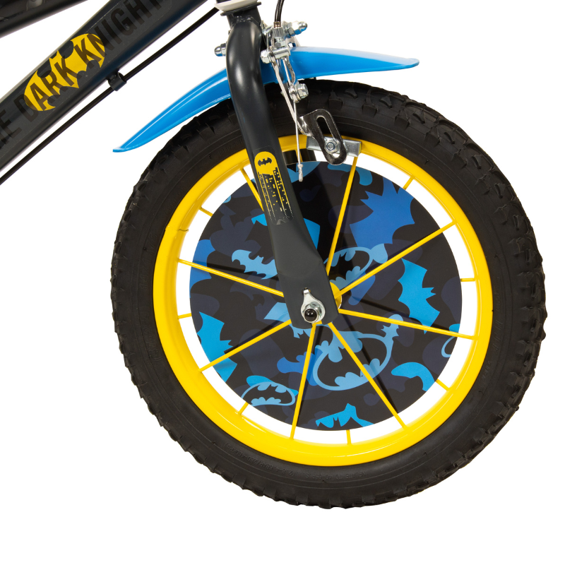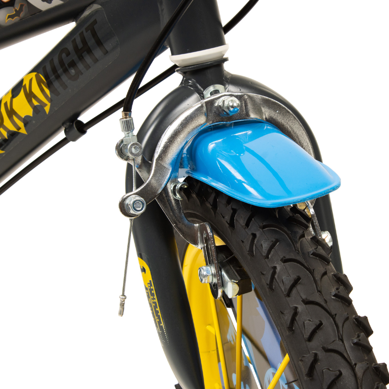This Batman-licensed 14” bicycle is perfect for little superheroes aged 4 to 6 years, with a height range of 100–110 cm. Finished in sleek black with vibrant Batman the Dark Knight decals, it features both a front caliper brake and a rear drum brake for reliable stopping power. The bike is equipped with 14” pneumatic tyres on sturdy spoked wheels, complete with blue mudguards to handle any adventure. Its removable stabilisers, adorned with the iconic Batman logo, make it ideal for beginners gaining confidence.