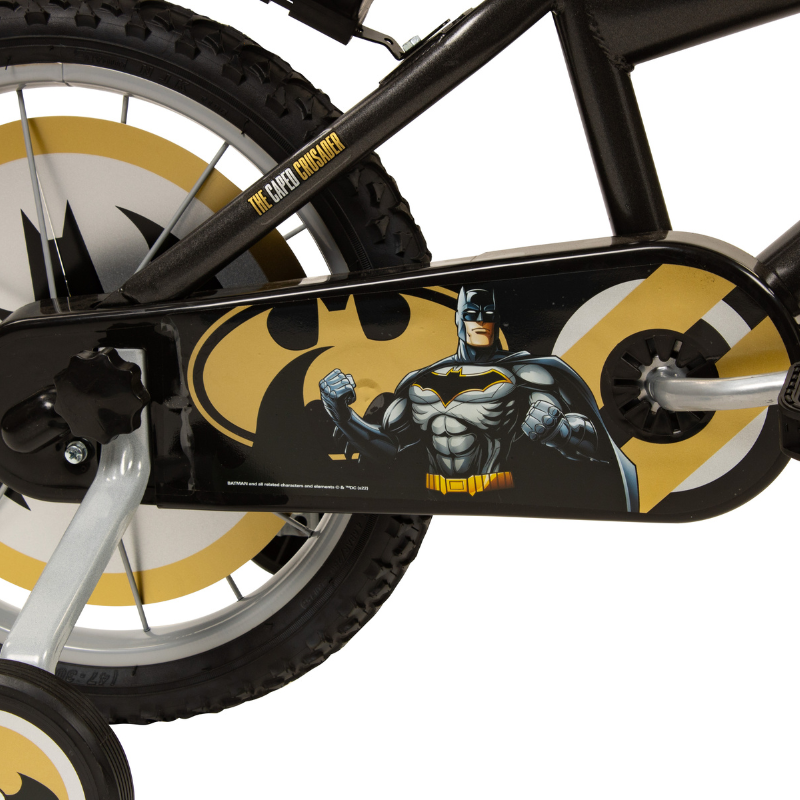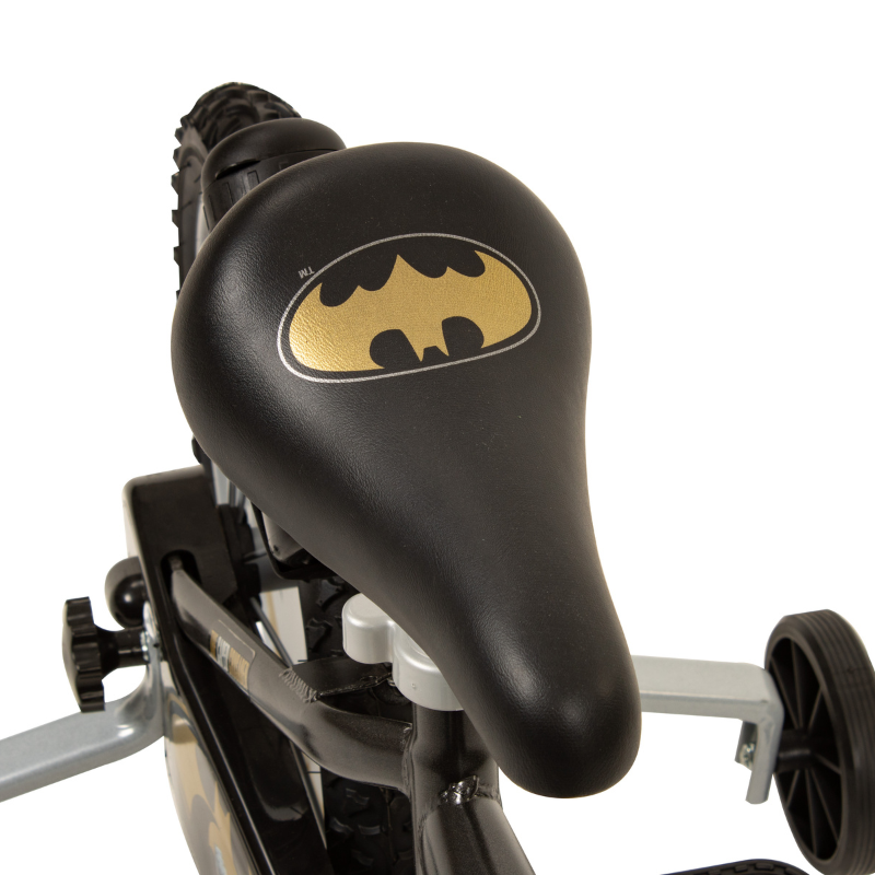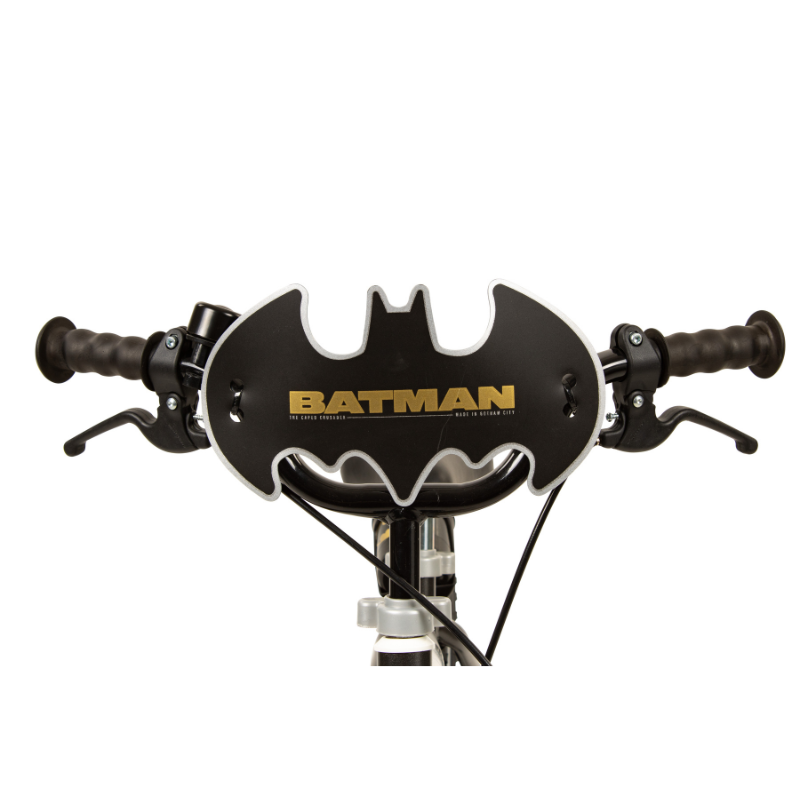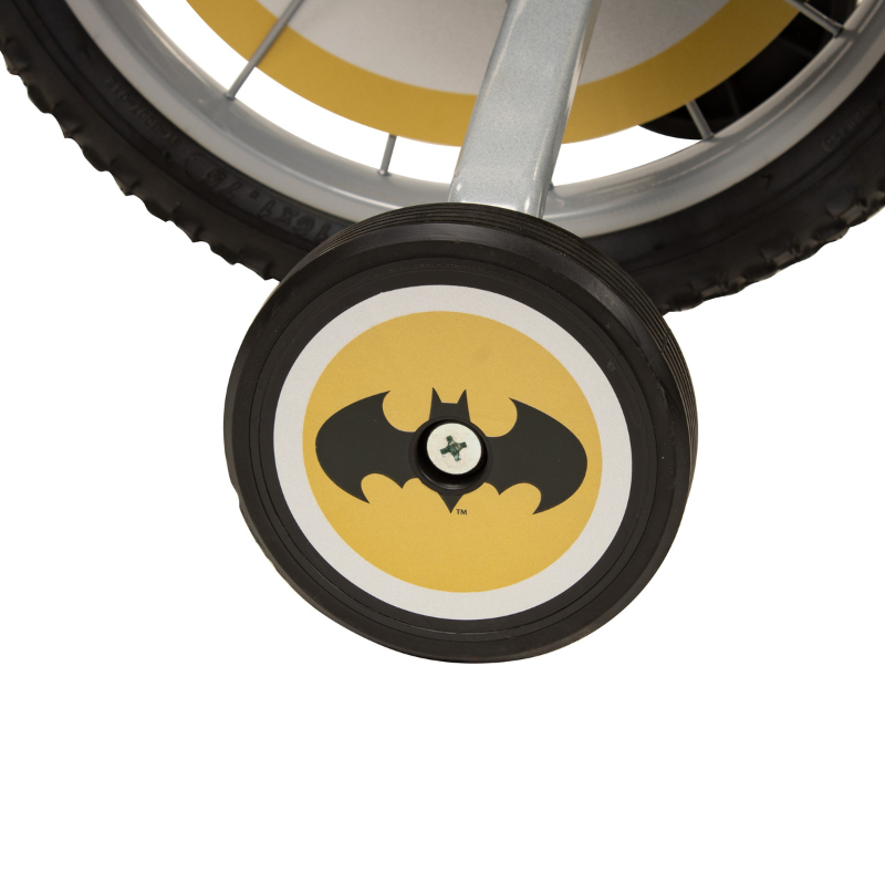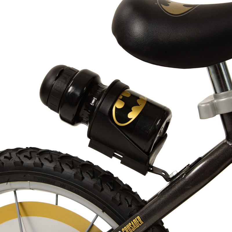 This Batman-licensed 16” bicycle is perfect for young superheroes aged 5 to 7 years (height range 110–120 cm), combining bold style and practical features. Finished in sleek black with striking Batman Dark Knight decals and a large front shield, it’s equipped with a front caliper brake, a rear drum brake, and 16” pneumatic tyres on sturdy spoked wheels. Removable stabilisers with Batman logos provide extra support for beginners, while the adjustable saddle and handlebars ensure the bike grows with your child. A rear drinks holder with a matching bottle adds convenience, making this bike a fun and reliable choice for endless adventures.