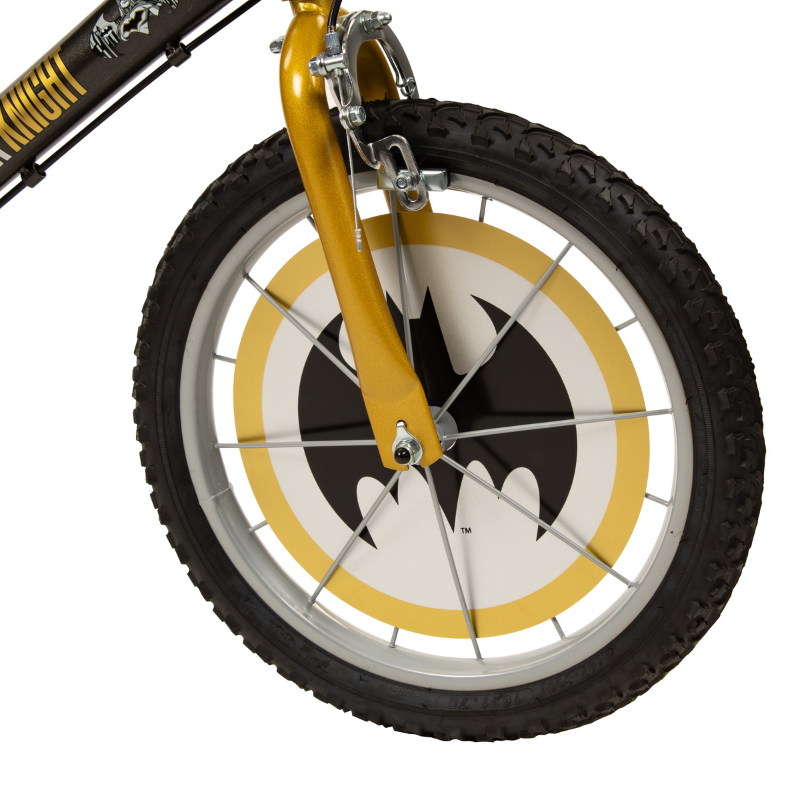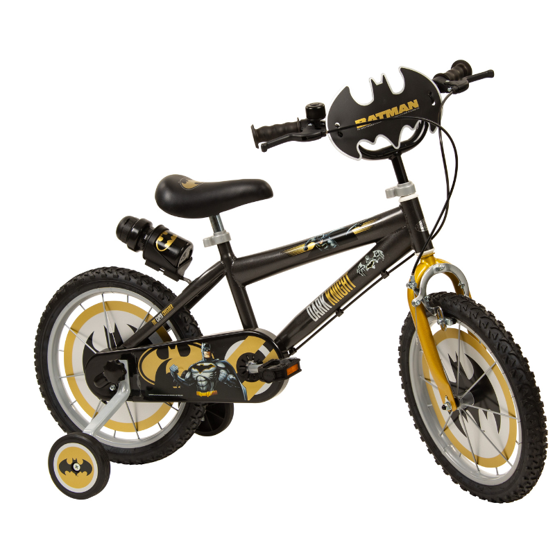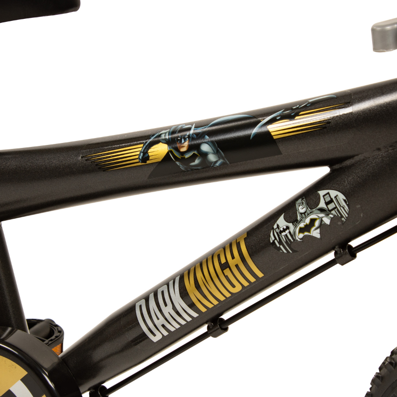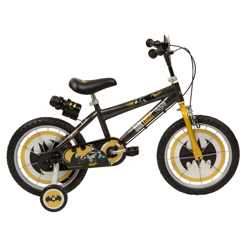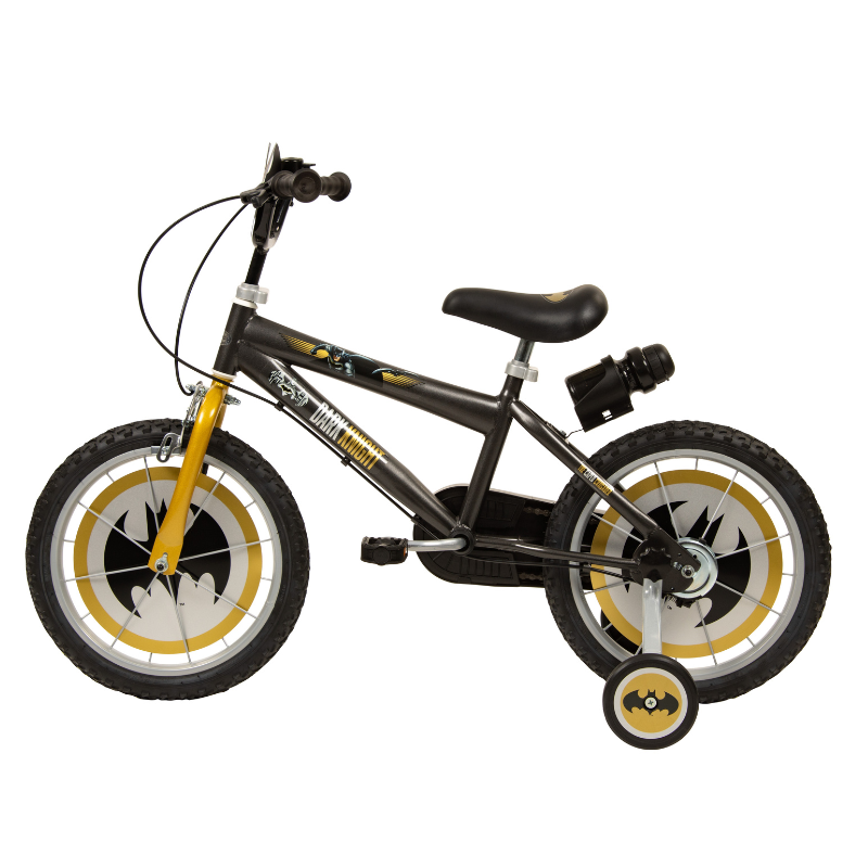 This Batman-licensed 16” bicycle is perfect for young superheroes aged 5 to 7 years (height range 110–120 cm), combining bold style and practical features. Finished in sleek black with striking Batman Dark Knight decals and a large front shield, it’s equipped with a front caliper brake, a rear drum brake, and 16” pneumatic tyres on sturdy spoked wheels. Removable stabilisers with Batman logos provide extra support for beginners, while the adjustable saddle and handlebars ensure the bike grows with your child. A rear drinks holder with a matching bottle adds convenience, making this bike a fun and reliable choice for endless adventures.