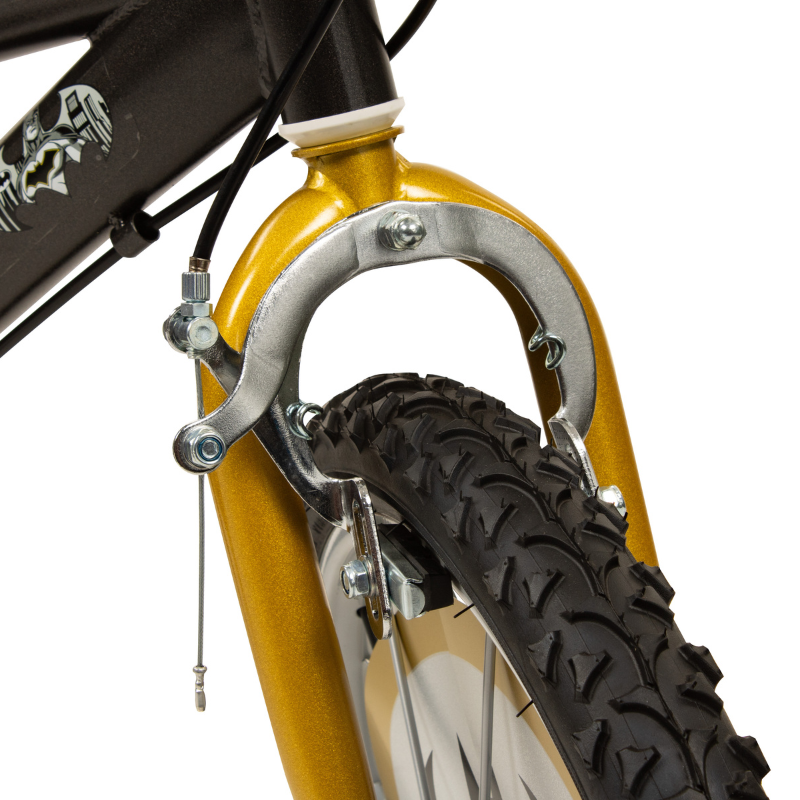 This Batman-licensed 16” bicycle is the ultimate ride for young superheroes aged 5 to 7 years, with a height range of 110–120 cm. Its sleek black design is brought to life with bold Batman Dark Knight decals and a striking front shield, giving it a heroic look. Equipped with both a front caliper brake and a rear drum brake, this bike ensures safe and reliable stopping power. The 16” pneumatic tyres on spoked wheels provide a smooth ride, while the removable stabilisers—complete with Batman logos—offer extra support for beginners gaining confidence.