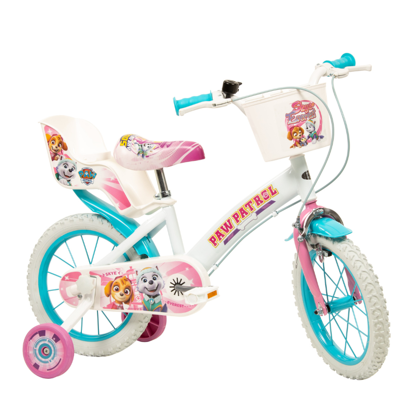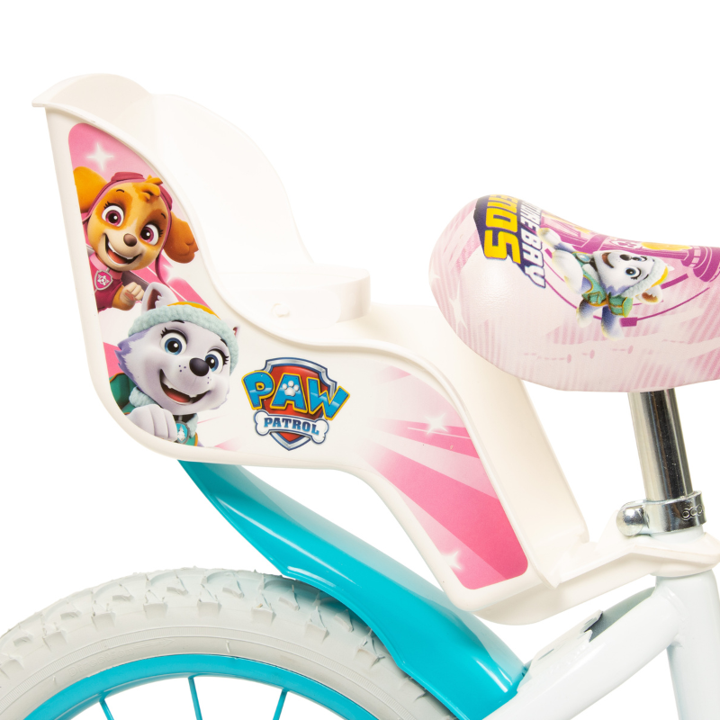 The freewheeling white Paw Patrol 14” Bicycle is perfect for little adventurers aged 4 to 6 years (height 100-110 cm). Designed for safety and fun, it features a front calliper brake, a rear drum brake, pneumatic tires with spoked wheels, and sturdy mudguards for a smooth, reliable ride. Removable stabilisers help build confidence, while the adjustable saddle and handlebars grow with your child. Complete with a rear doll carrier with a secure strap, a front basket for treasures, and vibrant Paw Patrol decals, this bike is ready to make every ride an exciting rescue mission!
